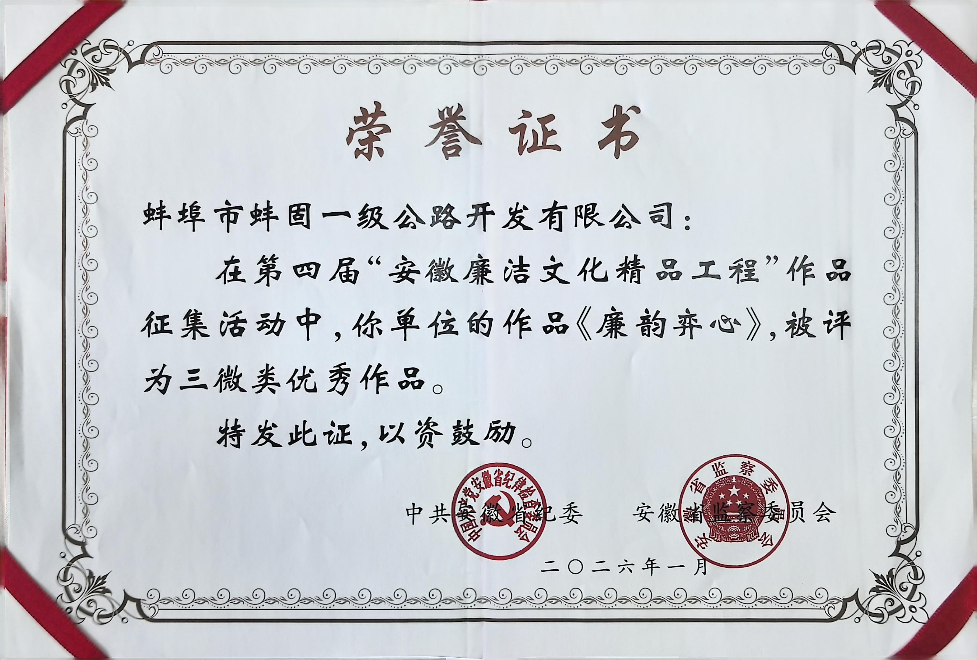 近日,中共安徽省紀委、安徽省監(jiān)察委員會正式公布第四屆安徽廉潔文化精品工程作品征集評選結(jié)果,由國控集團報送、交控集團選送、蚌固路公司創(chuàng)作的廉潔文化作品《廉韻弈心》,成功獲評三微類優(yōu)秀作品。該獎項是全省廉潔文化領(lǐng)域最高層級官方獎項,充分彰顯了集團廉潔文化建設(shè)的突出成效。